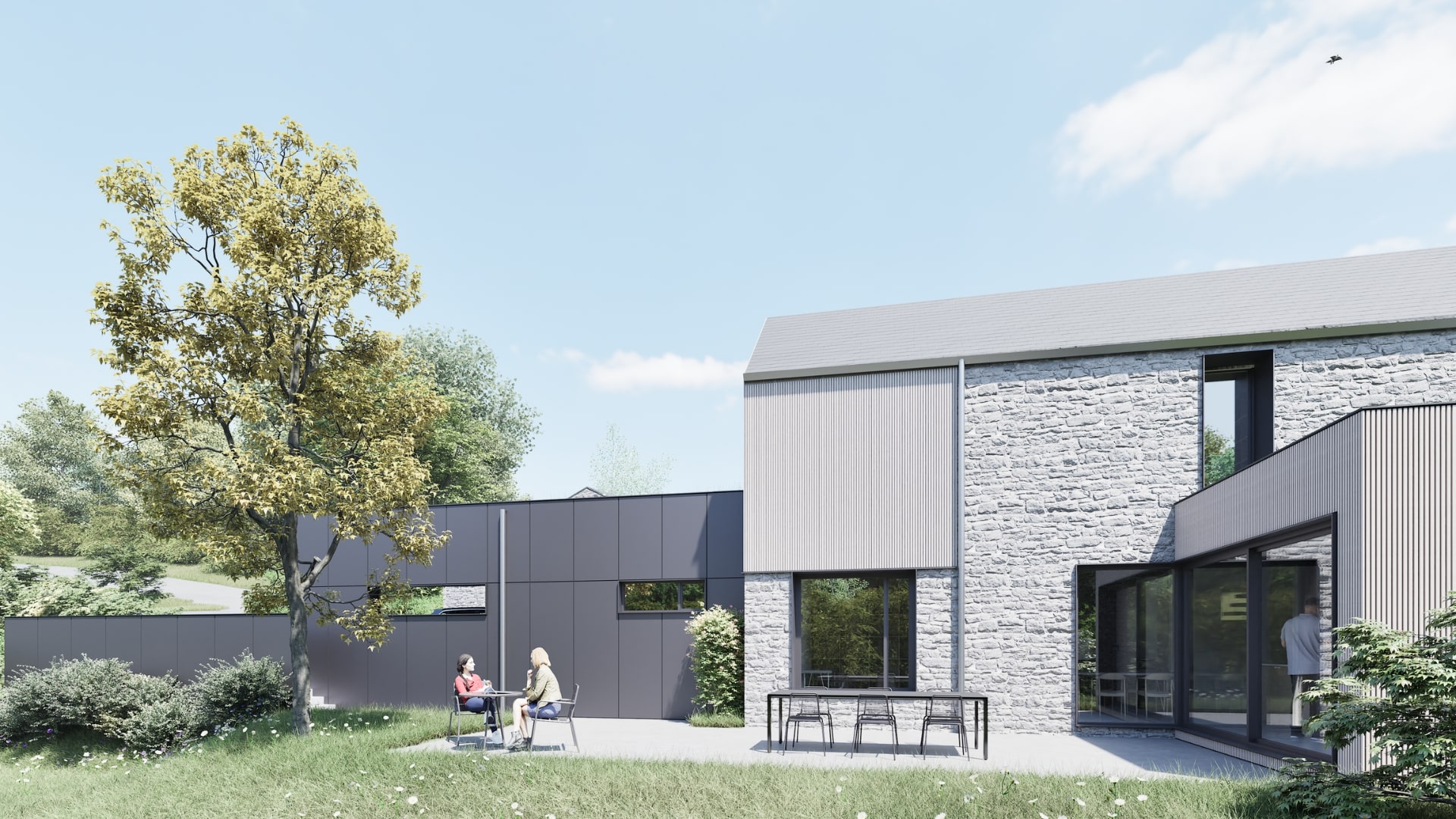 Extension d’une habitation à l’écriture contemporaine, pensée en relation directe avec le jardin. Le projet privilégie les interactions visuelles et les vues vers l’extérieur, avec une expression volontaire des volumes par le plein, contrasté par le vide des larges baies vitrées.
