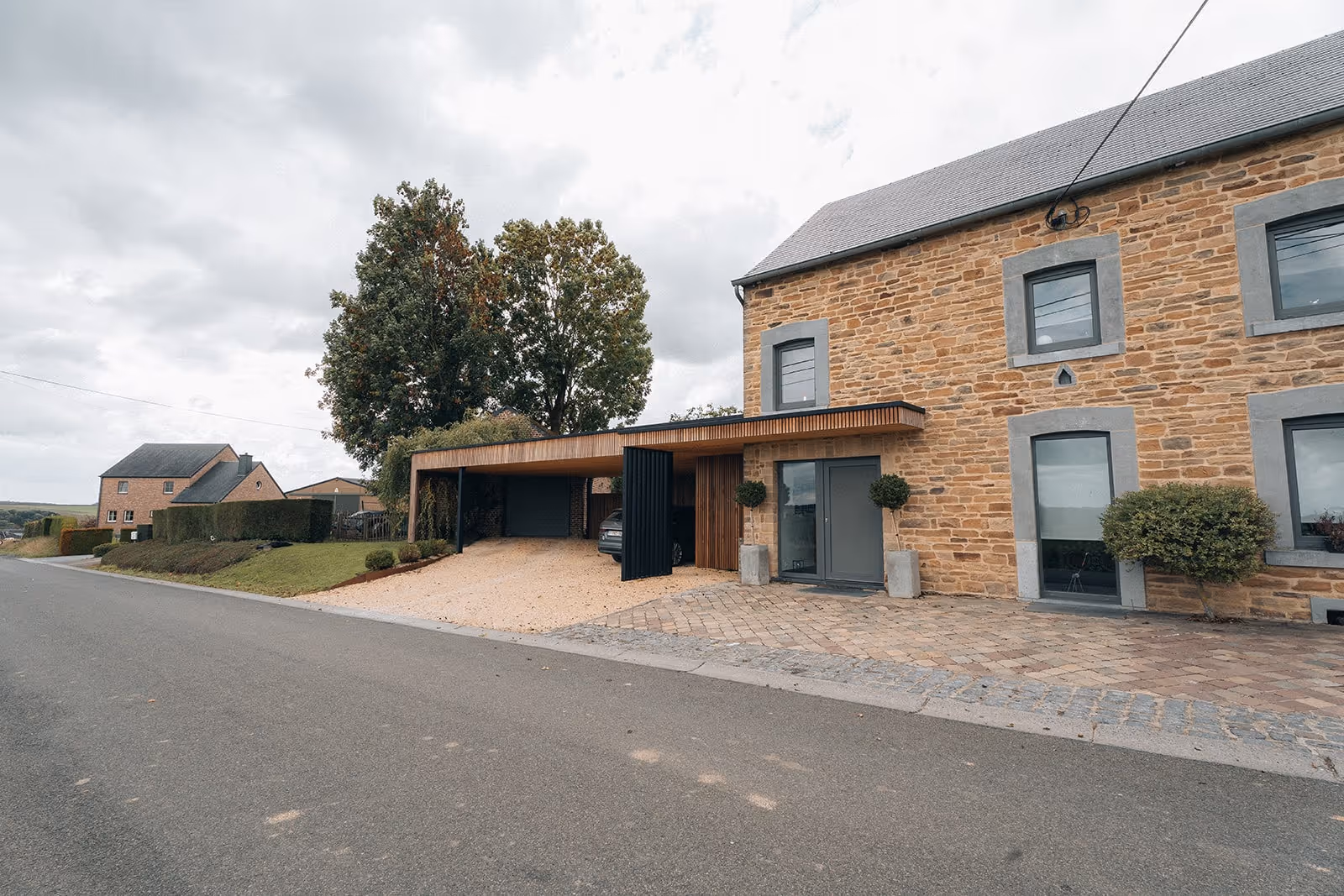 Création d’un carport pour articuler l ‘ancien garage et le hall d’entrée pour améliorer l’accessibilité tout en intégrant la végétation dans le projet.