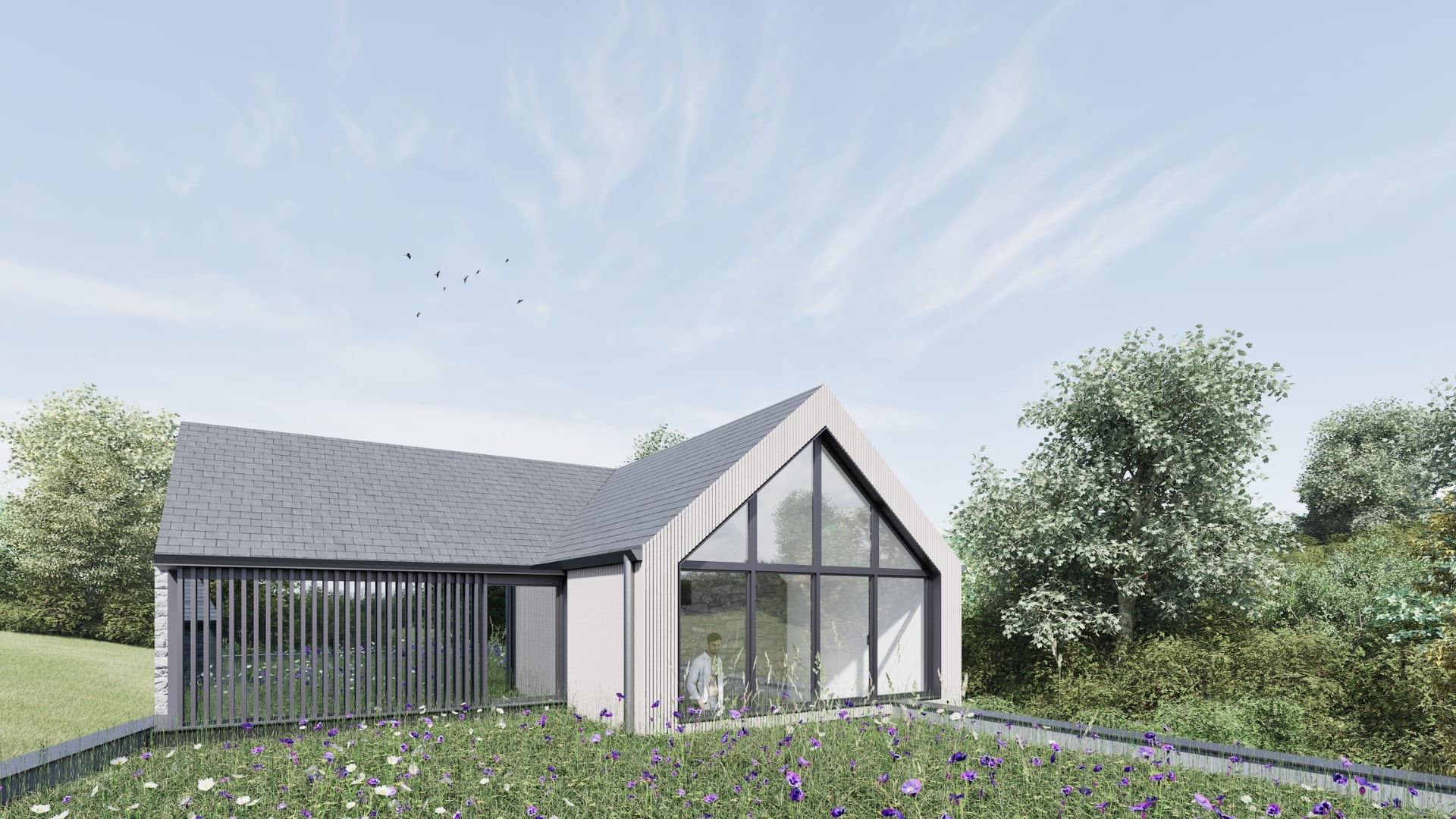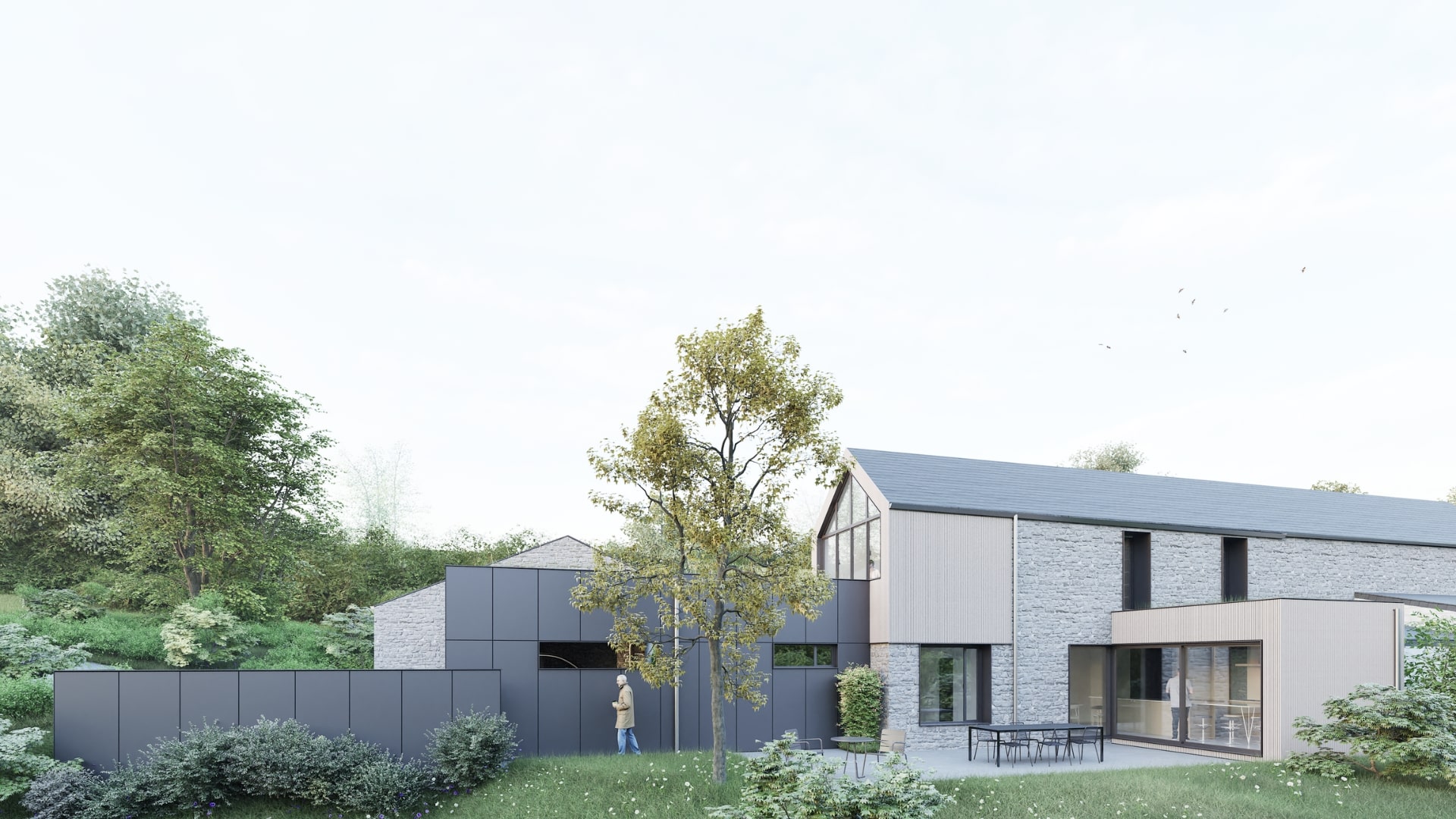 Transformation et extension d’une ancienne étable en habitation. Le projet s’organise autour des vues arrière, ouvertes sur les étangs, tout en structurant clairement les espaces privatifs et semi-publics grâce aux annexes et dépendances. Un soin particulier est apporté au choix des matériaux, afin d’inscrire l’ensemble des transformations et extensions dans le respect du caractère rural du bâtiment existant.